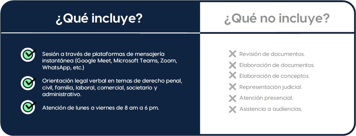 A través de la orientación legal virtual, contarás con un abogado especialista en el área de derecho al que corresponda tu caso (penal, civil, familia, laboral, comercial, societario, administrativo), quien te guiará en las acciones que debas realizar o te aclarará las dudas que tengas, sin importar el lugar desde el que te encuentres.